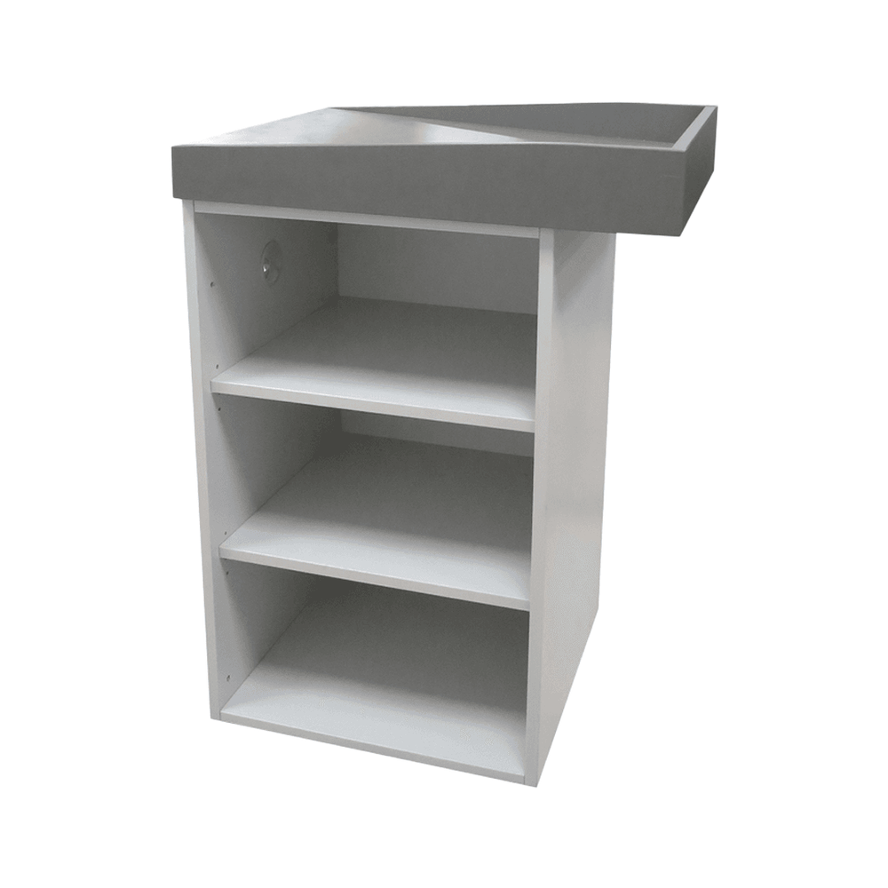 Le module caisse avec dessus incliné fait partie d’une gamme de modules pouvant être associés pour créer un meuble de caisse complet. Il est fabriqué à partir de panneaux mélaminés de 18 mm d’épaisseur avec chant PVC 2 mm. Il dispose d’un dessus inox incliné à 5°, de 2 étagères réglables en hauteur et de patins d’ajustement du meuble. Le plateau du dessus est modulable et peut se positionner aussi bien, à droite, à gauche ou droit.